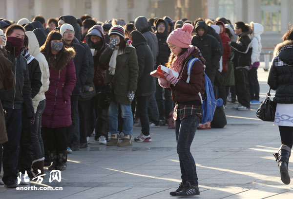 1月11日上午八点半左右,记者在天津站售票处看到,购买火车票的人早已排成“长龙”,从售票处向站前广场延伸了二百多米远,其中大多数是即将返乡的学生,时近中午12时,购票客流依旧不减。目前,为了保证其安全顺利购票,天津站现场已增加警力、志愿者等维护购票秩序。