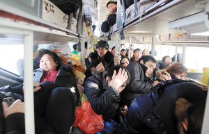 天津北方网讯:严格禁止超员超载和严查乘客携带危险物品历来是春运期间相关部门的工作重点。可是在北辰区刘家房子客运站,不仅安检成了摆设,就连车票都由司机随意卖,卧铺竟然卖成坐票,车内唯一的过道也铺上临时硬板床挤满了乘客,长途客车出站时就已经严重超载。