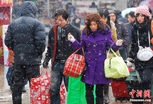1月19日,江西九江、南昌等多地持续降雪,江西2011年春运在风雪中正式启动。在九江火车站、南昌火车站看到,旅客提着笨重的行李,冒着风雪踏上回家的旅途。