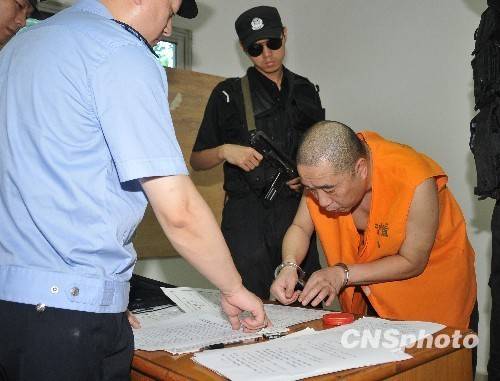 | 据重庆警方消息称,重庆庆隆屋业发展有限公司董事长、总经理彭治民,因涉嫌组织领导黑社会性质组织罪、组织卖淫罪、寻衅滋事罪、故意伤害罪、故意损毁财物、高利转贷罪、滥伐林木罪、非法占用农用田罪、行贿罪等犯罪,7月23日被重庆警方执行逮捕。其涉黑团伙成员45人同时被警方执行逮捕,涉嫌13宗罪。图为彭治明对口供签字画押。 |