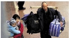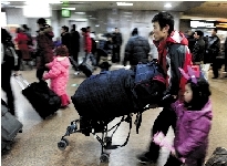 搬运行李,安徽籍的父女俩最有招儿,两包大行李堆在了婴儿车上,“这都是孩子小时候用的,现在大了,用不上了,干脆带回老家,正好还能用来拉东西,多省力!”