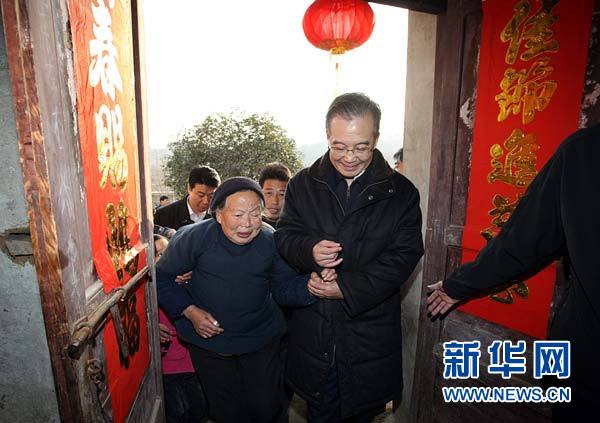 温家宝带着对老区的深厚情感,带着对群众的美好祝愿,一家家拜年,一户户看望。欢声笑语洒满村庄。