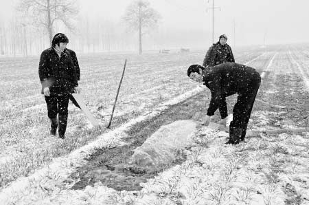 | 2月9日,河南省民权县程庄镇楚岗村农民尚荣彬(右)带着家人冒雪抗旱。 |