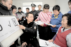 社区民警得知情况后,根据日常工作中积累的经验和网上下载的资料,判断这些怪异符号极有可能是窃贼行窃前留下的“行窃密码”。对此,北辰区宜兴埠镇综治办会同辖区派出所将常见的“行窃密码”制作成防范宣传卡片,深入到社区宣讲。建议居民提高警惕,一旦发现奇怪的符号,请尽快擦掉,以防自家财产遭受损失。下图为社区民警正在宜鹏园社区内向保安人员、保洁人员及部分业主讲解防范知识。