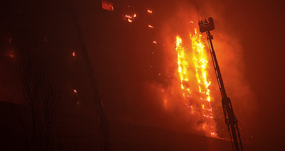 | 图为2月3日凌晨,沈阳皇朝万鑫国际大厦因烟花鞭炮引发大火。 |