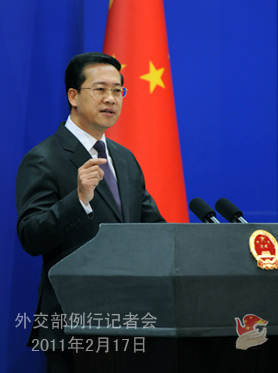 | 2011年2月17日,外交部发言人马朝旭主持例行记者会。 |