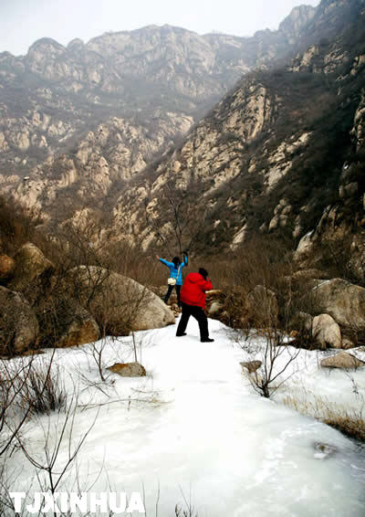 2011年2月20日,盘山大峡谷的残雪依存,景色愈加迷人。据当地群众介绍,盘山大峡谷冰川形成于每年十二月中旬到次年的五月底融化,峡谷溪流汇入北京平谷区的泃河。这里四季风光秀美,如诗如画,游客如织。特别是冬春季节的冰川奇观,使秀美的盘山锦上添花,令人流连忘返。(李江摄)