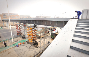 海河教育园人行天桥下月初完工,工作人员正在修筑天桥。记者 游思行 摄