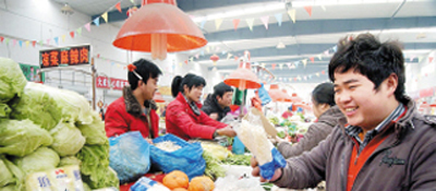 “还没出正月蔬菜价格就明显便宜了不少,过年那几天吃顿涮羊肉,都要花五十多块钱买菜。”昨天中午在靖江路市场买了一根白菜、三根黄瓜和一斤西红柿的袁大姐告诉记者,她春节时买这些菜大概要花十块钱,可是现在再买这些菜,她仅仅花了四块七,“便宜了一半呢。”和袁大姐一样,市场中不少采购蔬菜的市民都表示,“最近真是感觉到菜价便宜了。”当然市民也抱怨,“部分蔬菜品种的价格还是有点贵。”