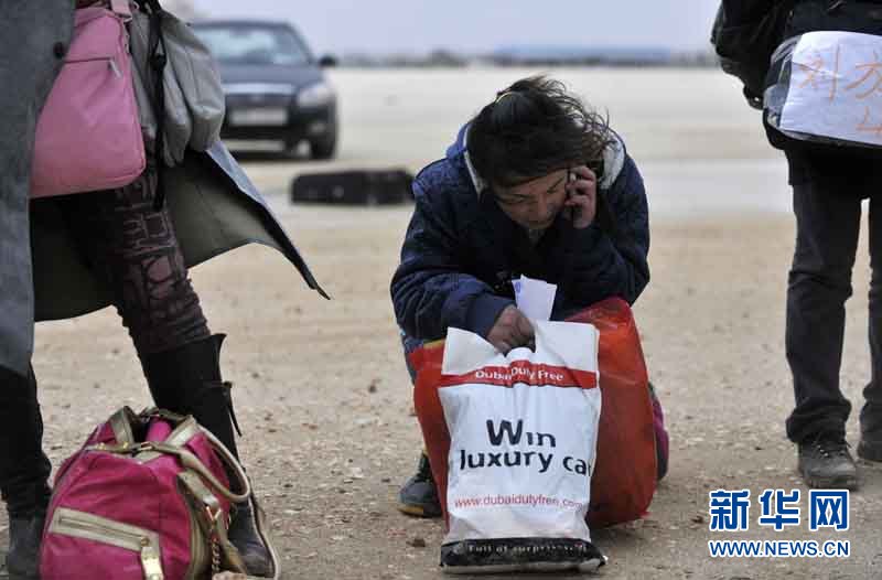 | 2月25日,在利比亚班加西港,一名准备撤离的中国女孩给家人打电话。中国驻希腊大使馆租用的两艘希腊客轮将4000多名在利比亚中方人员撤至希腊克里特岛后,于当地时间24日晚再次赶往利比亚班加西港,继续帮助撤离在利比亚的中方人员。 |