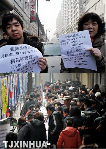 新华网天津频道2月26日电(记者岳月伟摄)元宵节过后,务工人员纷纷走出家门寻找工作,各地用工企业也随之进入招工高潮。相比之下而言,工资待遇较高、劳动环境较好、企业信誉度较高的企业招工相对容易,这些企业节后生产开工率达到60%―70%以上;而一些工资待遇较低、劳动环境较差、企业信誉度不高的企业招工却难上加难,目前的生产开工率只有50%,甚至更低。