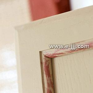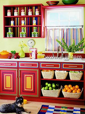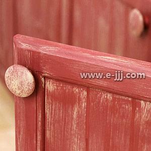 下层橱柜的粉刷特点。除了喷涂红色油漆外,适当的仿旧效果更加有趣。