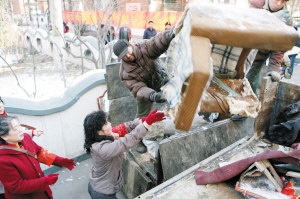 河西区越秀路街,清理工作从红波里转战到乘云里,近100名清理队员兵分两路,一路在楼道内清理楼道内堆物、废弃家具等弃物,另一路清理社区的花坛、绿地内的积雪、杂物和装修渣土。据河西区越秀路街城管科张科长介绍,“乘云里的楼都是6层甚至是7层,各家各户的杂物都比较多,特别是年后,礼品盒、纸盒、花盆、旧家具很多都堆积在楼道内,一栋楼的清整我们至少需要安排20人,‘传递接龙’,一层层往下运。”