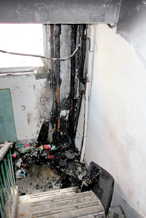 记者在现场看到,从3楼至1楼楼外满是水迹,楼道内弥漫着难闻的焦煳气味,2楼半角落里堆放的大部分杂物已被烧焦,几乎看不出原来的模样。上方的供热管道及电线也被烧断,2楼半的窗户被烧得面目全非,起火处周围的墙壁也被熏黑,甚至连三楼居民家的防盗门上也是一层黑灰。
