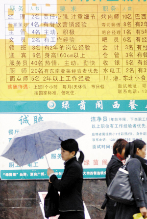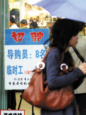 一服装店店主张先生告诉记者:“本来店里已经不缺人了,但是有一个店员不干了,所以又把招聘启事贴出来了。其实现在来面试的人很多,但是大多数人都干不长。有的人觉得1500块钱加提成的工资待遇太低,有的干两天觉得太累就又走了。”