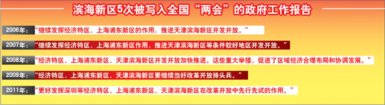 自2006年以来,滨海新区已5次被写入全国“两会”的政府工作报告。从每次报告对滨海新区的表述中可以看出,伴随着滨海新区开发开放步伐的加快,党中央、国务院对滨海新区在改革开放中作用和地位的要求也在不断提升。