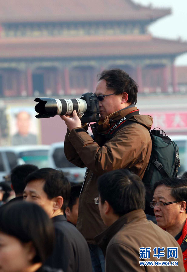 3月5日,第十一届全国人民代表大会第四次会议在北京人民大会堂开幕。这是在人民大会堂外,一名摄影记者站在梯子上采访拍摄。新华社记者刘卫兵摄