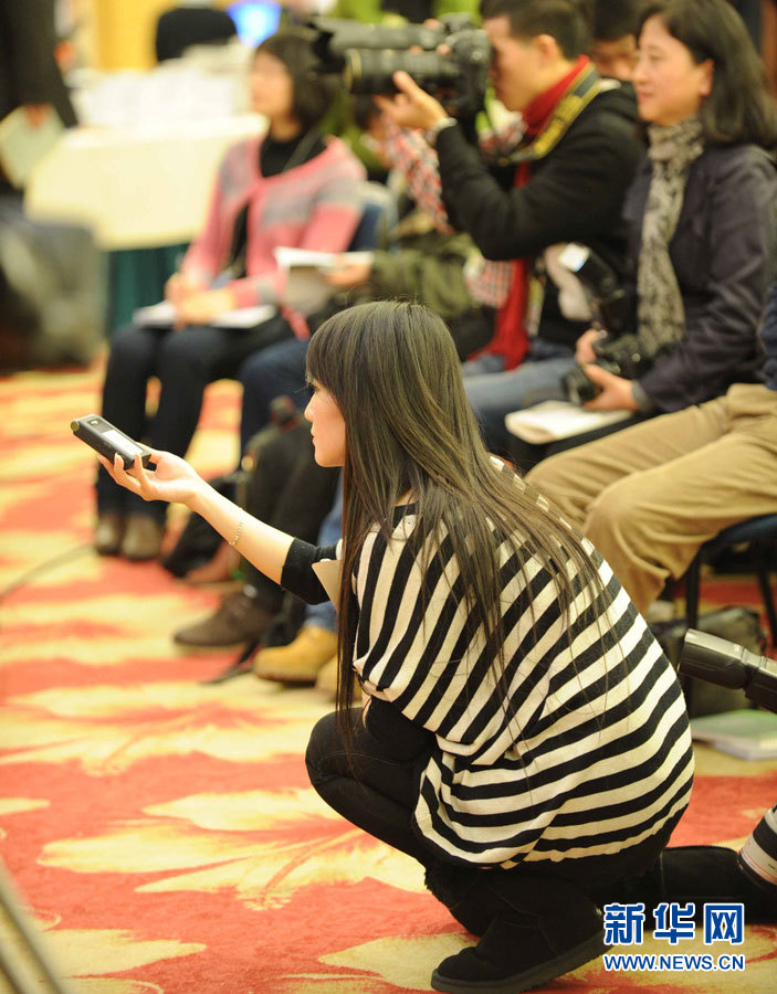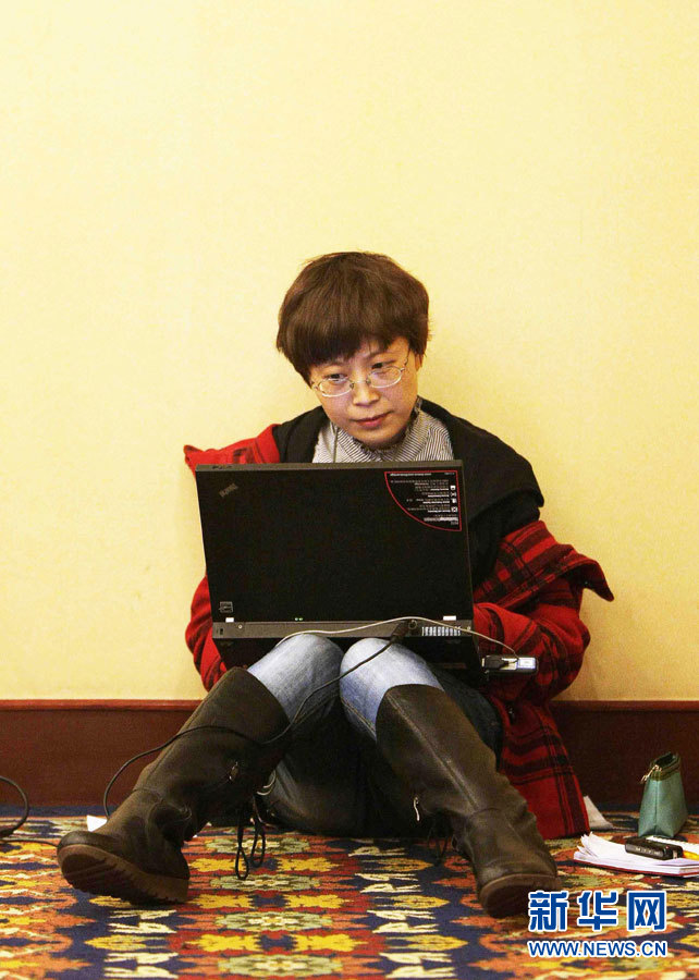 3月5日,在全国政协十一届四次会议经济界委员小组讨论会上,一名没有找到座位的记者在讨论会现场席地而坐,聚精会神地处理稿件。新华社记者郑焕松摄