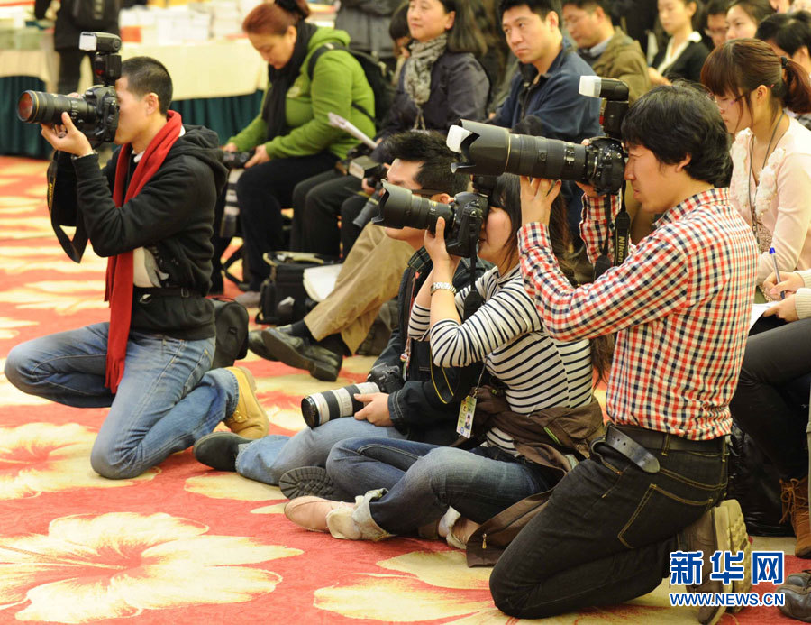 3月5日,媒体记者在北京梅地亚两会新闻中心采访。当日,全国政协十一届四次会议记者会在北京梅地亚两会新闻中心举行,主题是“政协委员谈协调推进城镇化与新农村建设”。新华社记者杨世尧摄