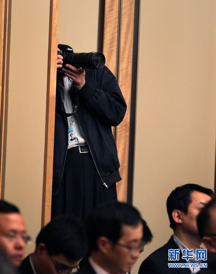3月5日,十一届全国人大四次会议上海代表团的审议吸引了众多媒体记者。这是一名摄影记者在选取最佳拍摄角度。新华社记者兰红光摄