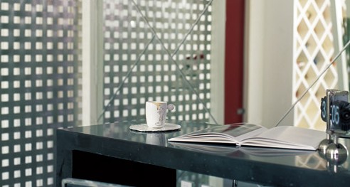 在整个房间中,细节上的呼应无处不在。菱形书架的一侧,有斜线分割的镜面;金属条编织的屏风后是条纹排列的坐凳;以墙面上的书架为中心,倾斜排列的线条却对称地彼此相合。这些细节在某个不经意的角度上,形成了魔幻般的吸引力。