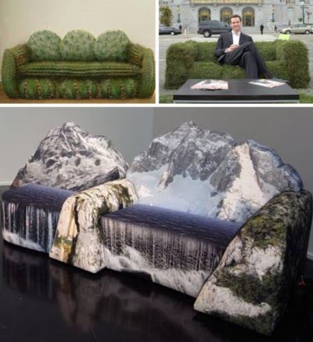 极富有想象力的沙发。我们喜欢山水,我们喜欢红花绿草,那么你有没有想象过你的家中放着自然风光的沙发是什么样子的呢?看看这三个沙发吧,它们都很有特色:一个是仙人掌沙发,一个是草从沙发,还有一个是瀑布沙发。这样的沙发放在家里,应该是一道风景线吧。