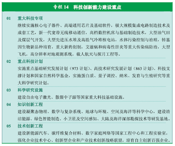 把握科技发展趋势,超前部署基础研究和前沿技术研究,推动重大科学发现和新学科产生,在物质科学、生命科学、空间科学、地球科学、纳米科技等领域抢占未来科技竞争制高点。促进科技进步与产业升级、民生改善紧密结合,面向经济社会发展重大需求,在现代农业、装备制造、生态环保、能源资源、信息网络、新型材料、公共安全和健康等领域取得新突破。加快实施国家重大科技专项,增强共性、核心技术突破能力。