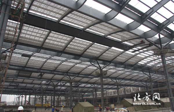 “目前,玻璃屋面正在装修阶段,屋面已经完成了80%左右,四月底可以全部完工,实现装饰部分屋面封顶。”王宝峰向记者介绍,“主站房的建设采用了很多先进工艺,如主立面玻璃透光率可以达到90%以上,这种标准的玻璃在中国只有两家厂商可以生产。主立面的玻璃全部为异形,最大块的玻璃上弧长达到4.4米,下弧长达到4.2米,高度达到2米。无论是生产还是安装都需要很高的技术含量。”