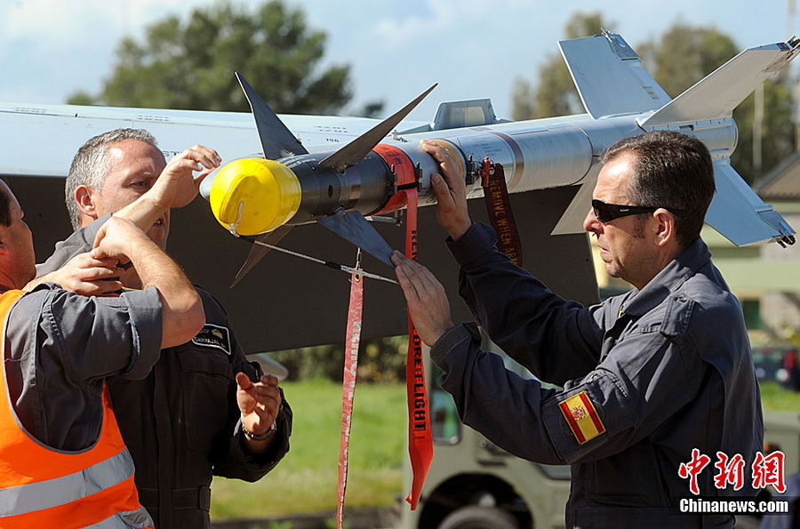 西班牙地勤在意大利基地内为本国F/A-18C装载AIM-9L导弹,西班牙的F/A-18C与加拿大的CF-18C都是购自美国。