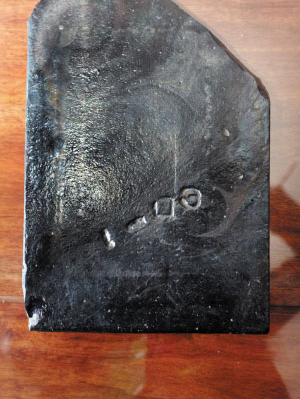 这块石头整体呈深黑色,用手轻轻敲打,石头发出清脆的声音,分量足有几十斤,石面上还有一些纹路和4个符号。“那家鉴定中心的人也没有说出来什么,我也查过很多书籍,但一直没有答案。”