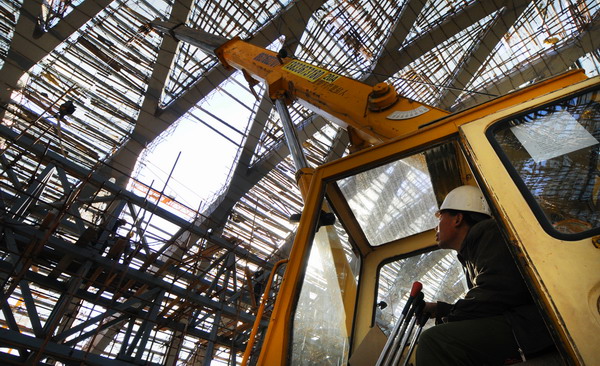 采光通透明亮的高架候车大厅工人们正在施工作业