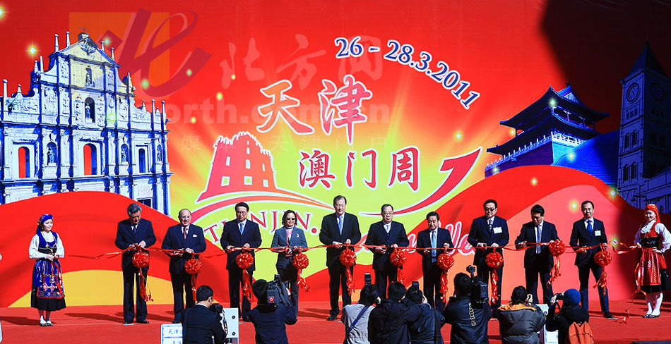 天津北方网讯:26日,由澳门特别行政区政府与天津市政府合作举办的“2011天津·澳门周”专项展览在和平路商业街拉开序幕,介绍澳门风土人情的展台,各色食品、服饰及歌舞表演,让津城市民在家门口感受到了纯正的澳门风情。图为极具澳门特色的舞龙。(记者 马成)