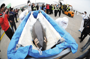 3月30日下午,由长沙海底世界公园从日本引进的4头太平洋瓶鼻海豚乘专机从日本抵达长沙黄花国际机场。湖南出入境检验检疫局的工作人员在机场对4只海豚进行包括核辐射在内的多项检测合格后,4只海豚被运往长沙海底世界公园的暂养房内。经过一个月的隔离喂养后,4只海豚将与游客见面。图为工作人员对装载海豚的箱子外壁进行消毒。新华社发