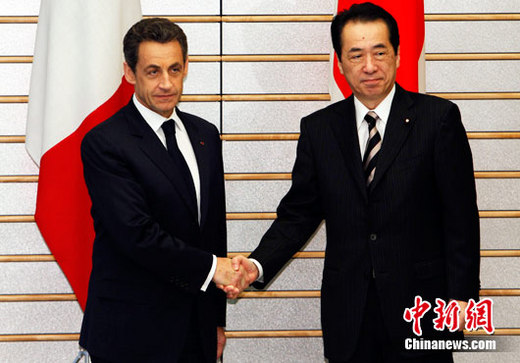法国总统萨科奇抵达东京进行访问。图为日本首相菅直人在首先官邸会见法国总统萨科奇