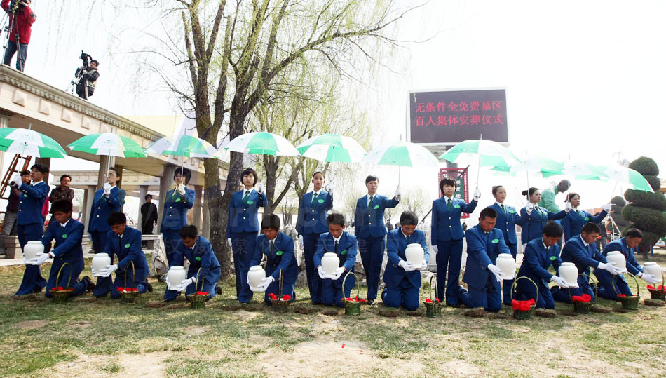 天津北方网讯:2011年4月5日永安公墓“无条件全免费墓区”安葬170位逝者,分别在上午7:00和10:00举行有史以来最大规模的安葬仪式,庄严隆重地送逝者最后一程。“无条件全免费墓区”对具有环保意识、接受全新安葬形式的客户实行全免费服务。(记者 马成)