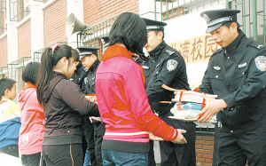 近日,河西分局特警一大队的特警队员们依托分局图书馆精选部分名人传记、科普知识、文学艺术、学习辅导等内容的少年儿童读物建立起了的小型流动图书馆,每周定期开展一次,让外来务工人员子女能像城里的孩子们一样享受到图书知识给他们带来的快乐。图为特警队员向孩子们赠送文具和科普图书。