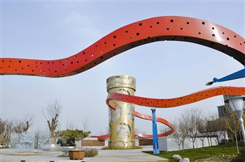 天津园位于世园会“陕西省内展园”与“国内展园”的交接处,位置优越。还没靠近天津展园,记者便被远处园内主题景观“金樽”所吸引。正在现场忙碌的天津城市绿化工程服务中心部长刘学伟告诉记者,“金樽”高12米,下半径4米、上半径5米,“金樽”上透空雕刻的“精卫填海”图案以底纹来体现天津特色,四面的主体图案则为不同形式的“龙凤呈祥”图案,寓意着城市和谐、繁华的发展,具有聚焦众眸、引领灿烂未来之意。