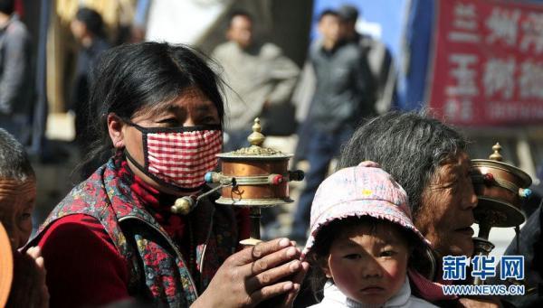 | 4月13日,藏族群众在新寨玛尼堆的经堂前摇动转经筒祈福。 |