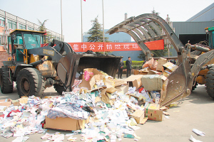 随着指挥员一声令下,假发票销毁活动正式开始。铲车司机用铲车将假发票、假证铲起转移至一台类似大夹子的专业铲车中。通过挤压,这台专业铲车再将这些假发票、假证件直接送入专门用于输送原料的传送带上,传送带再将它们输送到化浆池。几分钟后,小山似的假发票、假证件被集中销毁完毕。经过重新回炉,这些假发票、假证化成了造纸用的原料纸浆。据现场民警介绍,昨天的销毁活动是几年来本市首次大规模集中公开销毁活动,这种回炉化成纸浆的做法低碳环保,使资源循环利用。据技术人员介绍,集中销毁的假发票和假证重量约为2.4吨,重新化成原料纸浆后可以重新造纸2吨。