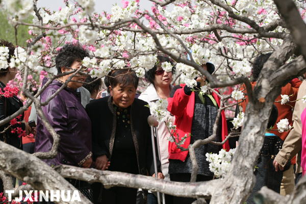 4月16日,天津长虹公园碧桃花开,吸引着大批市民和游客前来游园赏花。