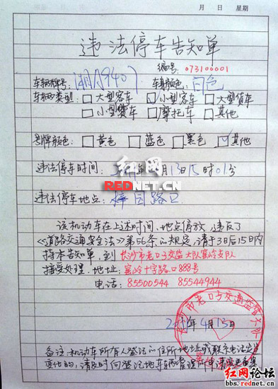 记者前往现场求证,周边居民证实,前几天确实有警车停在此处,不过没多久就开走,详情不清楚。针对此帖,市公安局交通警察支队回复称,当时该车是因工作需要临时停靠。 网帖:“血性网友给警察开‘人民罚单’”4月13日,人人网一篇题为“血性网友给警察开‘人民罚单’”的帖子迅速蹿红。发帖人“范沙”自称是长沙一名普通市民,帖子介绍:4月13日,长沙梓园路口,在一块写有“禁止任何机动车辆在黄色网状线内停放”牌子下面,停放着一辆警车。帖中说,“任何机动车辆应该包括警车,这辆车可能过于不打眼所以被交警同志忽略了”。于是,发帖人“代表人民的力量”给这辆警车开了一张“罚单”。