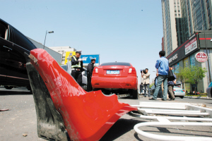 昨天,在大沽南路与中环线交口,一辆红色轿车跨越隔离带逆行连撞6车,无人员伤亡。本报记者段毅刚摄