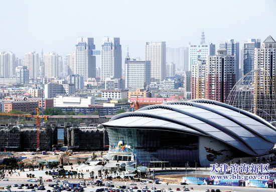 中国网·滨海高新讯4月17日,记者在刚刚建好的浙商大厦楼顶眺望建设中的滨海新区,一座座高楼大厦拔地而起,蔚为壮观。正式对外开放的极地海洋世界仿佛巨鲸一般,成为滨海新区又一新景点。(文/记者胡晓春图/实习生贾成龙)