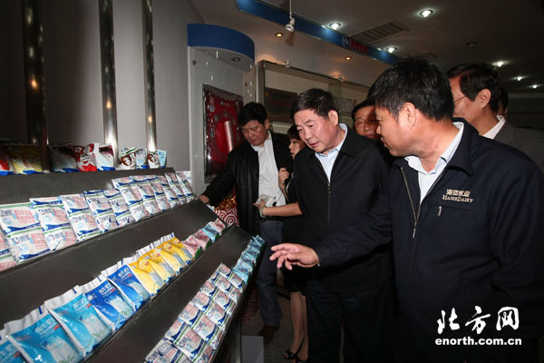 天津北方网讯:今年二月下旬以来,市人大常委会执法检查组对本市实施《中华人民共和国食品安全法》情况开展执法检查。昨日,部分市人大常委会组成人员、市人大代表进行了集中检查,市人大常委会主任肖怀远,市人大常委会副主任李亚力、李润兰,秘书长王世新参加。副市长张俊芳和市人大常委会、市政府有关部门负责同志陪同。