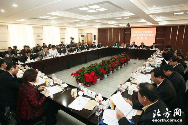 在检查中,代表和委员实地察看了天津海河乳业制品有限公司、天津职业大学学生食堂,详细了解了原料采购、仓储管理、生产加工、餐具消毒、环境卫生等方面的情况,听取了市食品安全委员会办公室负责同志关于本市实施食品安全法情况的汇报和市商务委、市农委、市工商局、市卫生局、市质量技术监督局的书面汇报。执法检查人员充分肯定了市政府及有关部门贯彻执行食品安全法所做的工作和取得的成绩,并就加大食品安全源头治理力度、进一步提高食品生产加工企业准入门槛、加强食品安全诚信体系建设等方面提出了意见和建议。
