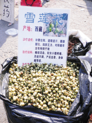 在刘先生指点下,记者见到了贩卖雪莲花的小摊,操着东北口音的小贩告诉记者,这两种花都是名贵药材,也是他们从西藏特意采购来的,当地人采集到了新鲜的花朵后,就直接放在阳光下晒干,然后才拿出来销售,他们通常要走上很多家,才能收集到一袋子这样的干花。因为是纯天然的,没经过任何加工,泡在水中或是茶里就可以直接饮用。在另外一个摊位上,也见到了那种被称为肾兰花的干花,一旁的标牌上说这种花的产地在云南,对男性疾病有治疗作用,并且也可以直接泡水喝。贩卖这种花的小贩说话也带着浓重的东北口音,但是他却对于肾兰花的来历不太清楚,只说云南西双版纳人习惯在泡茶的时候使用,对身体很有益处。