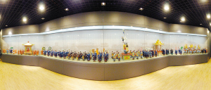 天津皇会是为祭祀海神天后娘娘诞辰而举行的大型庆典,是天津最为隆重的民俗活动。展品中一组长达近20米长的“皇会仪仗”,实景再现这一重要的民俗活动,是由金线人偶工艺大师孟庆慧历时半年完成的,着力表现了108名手执各色仪仗的出会人员,为妈祖娘娘所乘宝辇护驾的壮观场面。