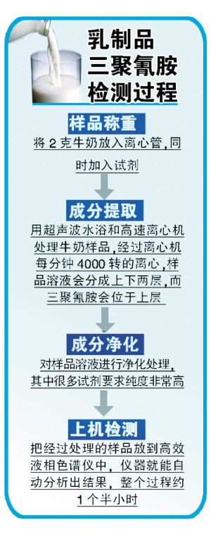 “检测三聚氰胺需要用到的主要设备就是高效液相色谱仪,这是一种能够检测微量成分的自动化分析仪器。但是,并非像普通消费者想象的那样,直接把需要检测的牛奶倒进仪器就可以了。因为这种仪器具有非常高的灵敏度,因此普通的杂质必须经过处理进行分离,但是又不能把三聚氰胺成分分离出去,因此,牛奶样品的前期处理就非常重要。”检测中心负责乳制品三聚氰胺检测的检测人员小刘说。这个过程需要用到的仪器包括超声波水浴和高速离心机,经过离心机每分钟4000转的离心,溶液会分成上下两层,三聚氰胺会位于液体的上层。