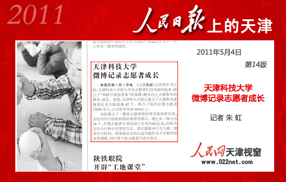 人民日报天津5月3日电(记者朱虹)五四青年节之际,天津科技大学的大学生志愿者们自发组织起来,推出了“奉献中绽放青春”的微博,畅谈自己志愿服务的感受、成长。据悉,天津科大目前已建立了志愿服务基地及社会实践基地42个,吸引了校内注册志愿者12200余人,占全校学生的60%以上。