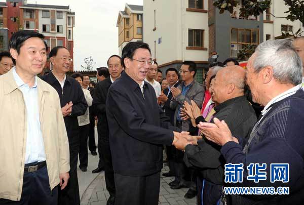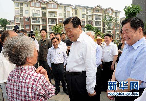 | 5月7日,贾庆林在都江堰市幸福镇民丰社区考察安置房建设并看望群众。 |